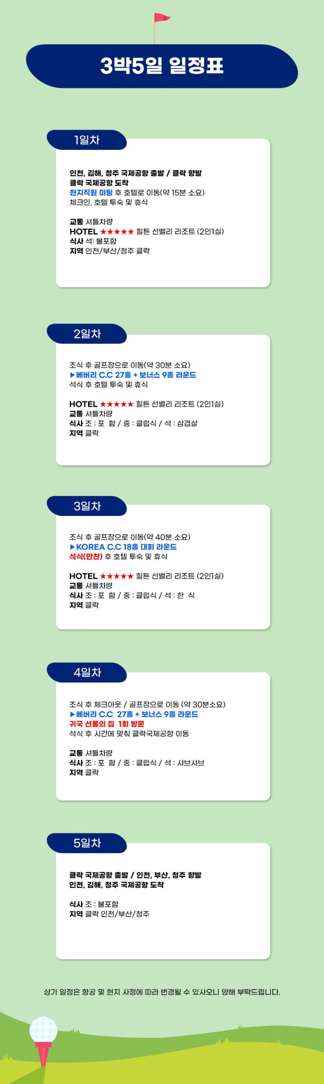 ๐ฝ ์กฐ์ ํฌํจ → ์ฒดํฌ์์ → ๊ณจํ์ฅ ์ด๋(์ฝ 30๋ถ)