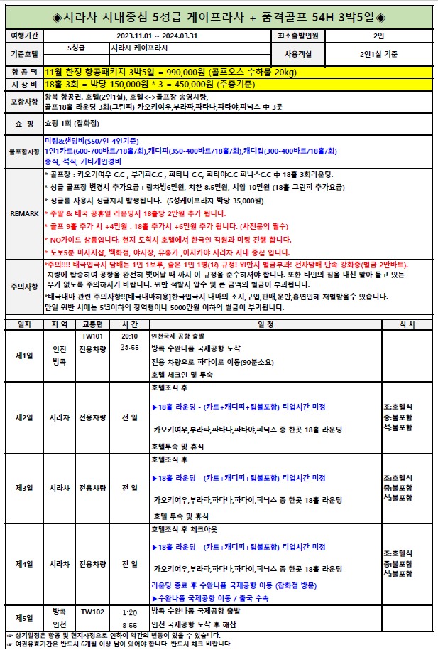 📢 성수기 초특가 항공팩 3색 3박5일 54홀 주중 기준