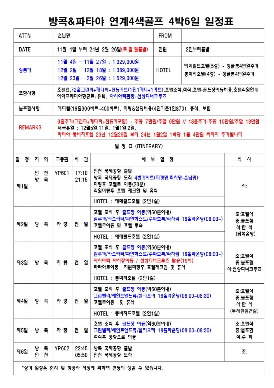 ✴️방콕&파타야 4색골프 <4박6일>