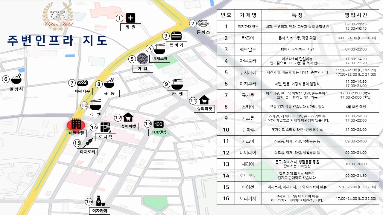 📌 호텔 주변 도보 5분 이내 이자카야, 야키니쿠(고깃집), 야키도리(꼬치구이), 라멘, 규종(덮밥)식당 및 마트, 맥도날드, 100엔숍 등 다양한 저녁식사와 쇼핑 가능