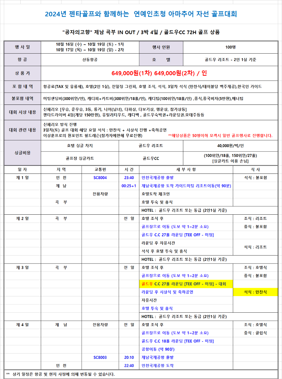 골프대회를 10월16일(수),17일(목)~19일(토),20일(일) 3박4일