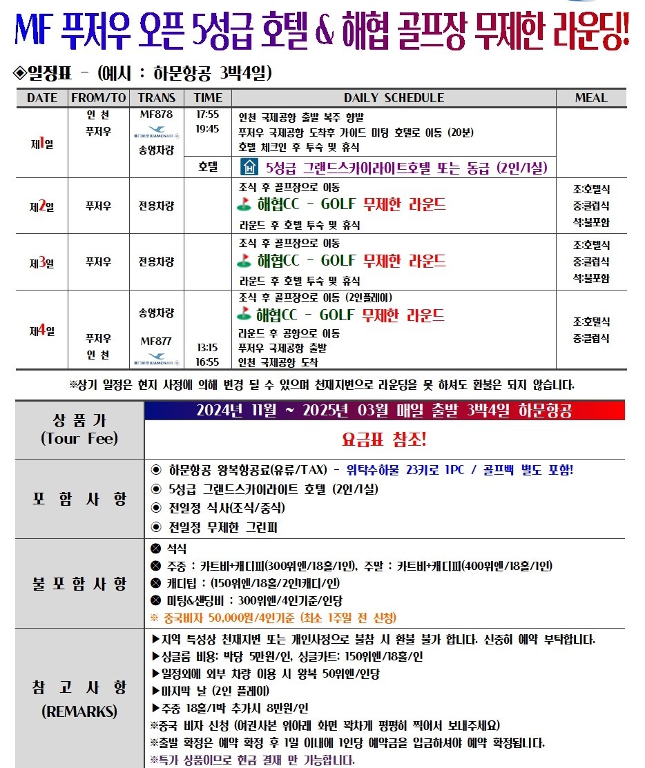 ※리턴일 MF 877 (푸저우 13:15 출발 – 16:55 인천 도착)
