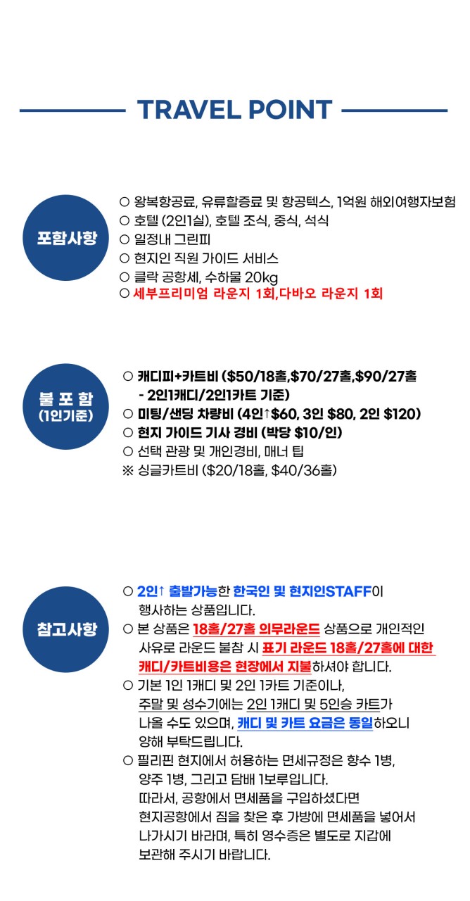 ● 현지 오후출발 항공편은 18홀/27홀 라운드를 제외시켜도 지상비는 동일합니다.