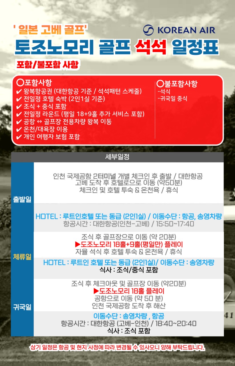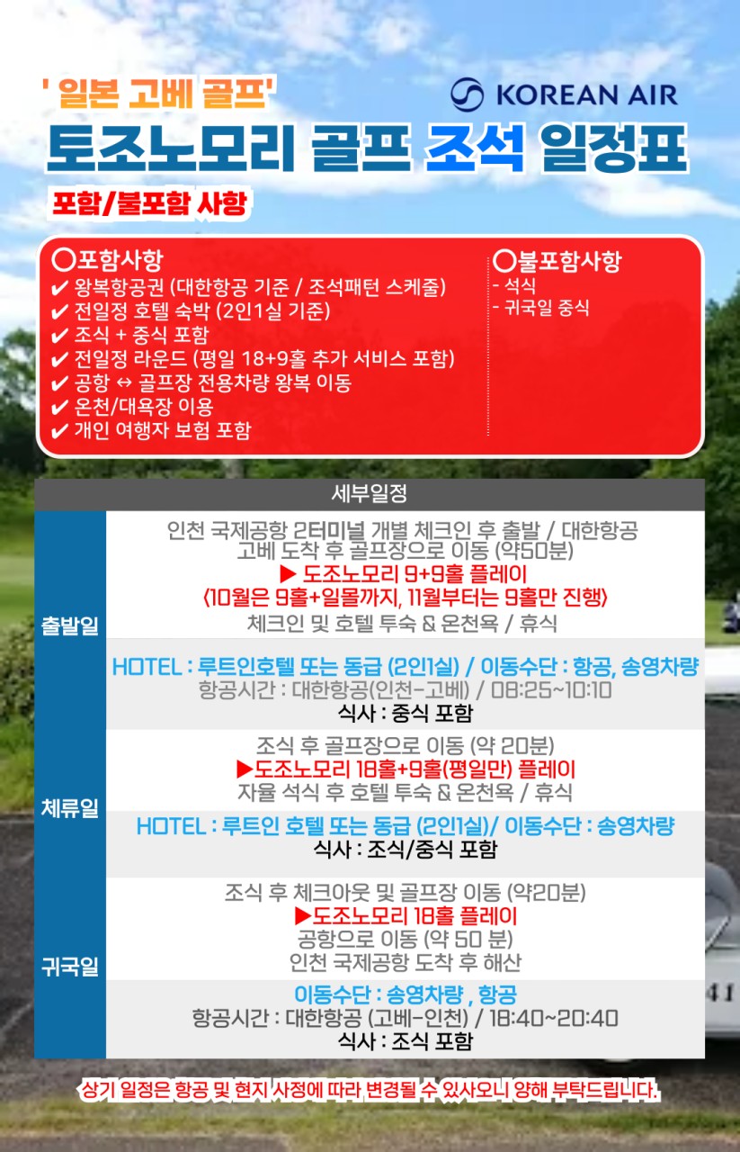 - 골프코스 및 티오프 시간 안내: 일정 중 골프코스는 2~3곳 이용 , 골프코스 및 티오프 타임은 임의 지정이 불가합니다