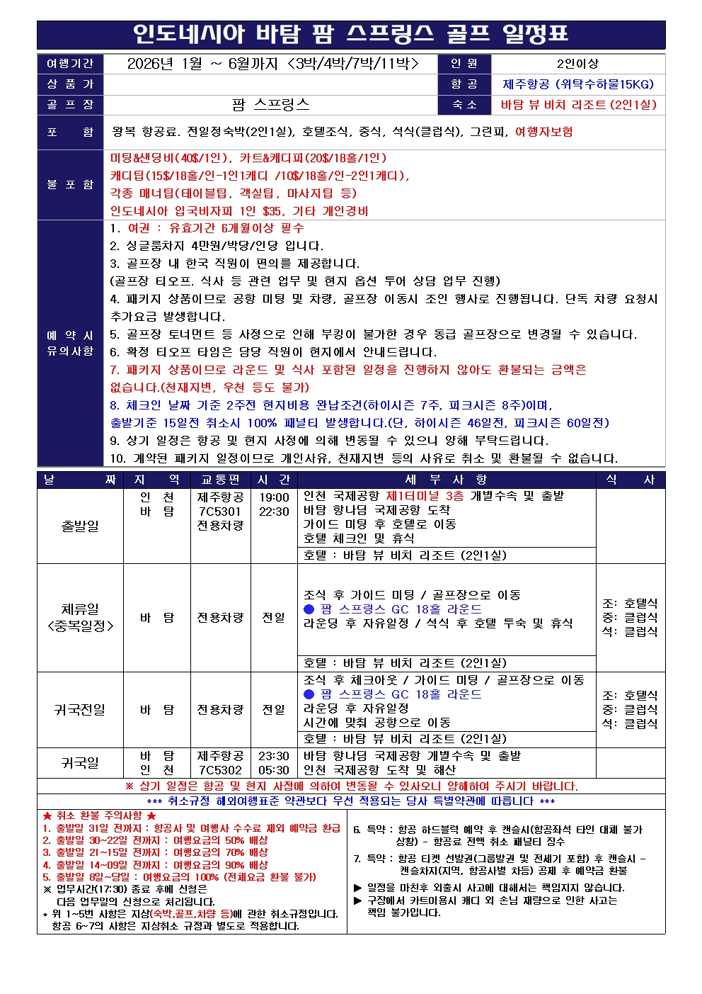 - 패키지 상품이므로 라운드 및 식사, 포함된 일정을 진행하지 않아도 환불되는 금액이 없습니다. (천재지변, 우천 등도 불가)