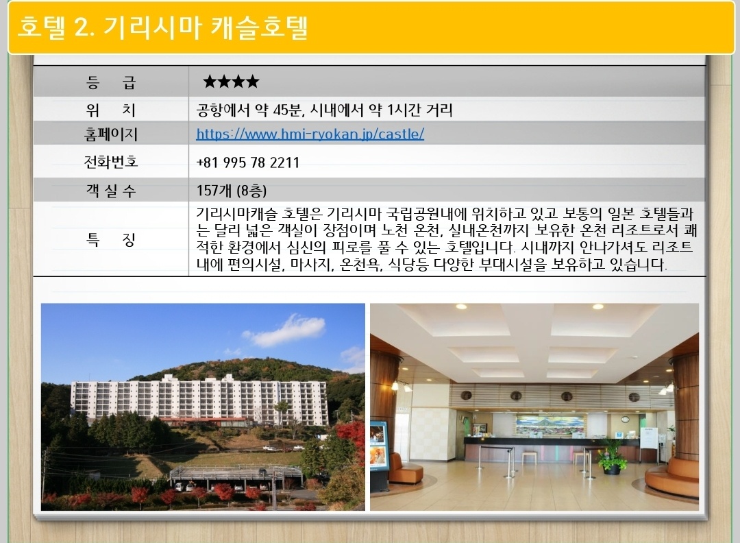 백수관,시로야마호텔,카도인리조트,기리시마캐슬,모치오