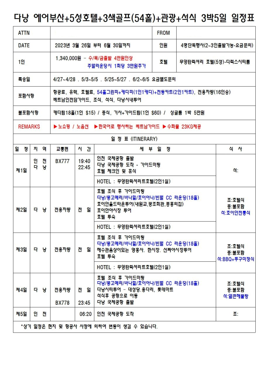 다낭3색골프+5성호텔+다낭투어+석식포함