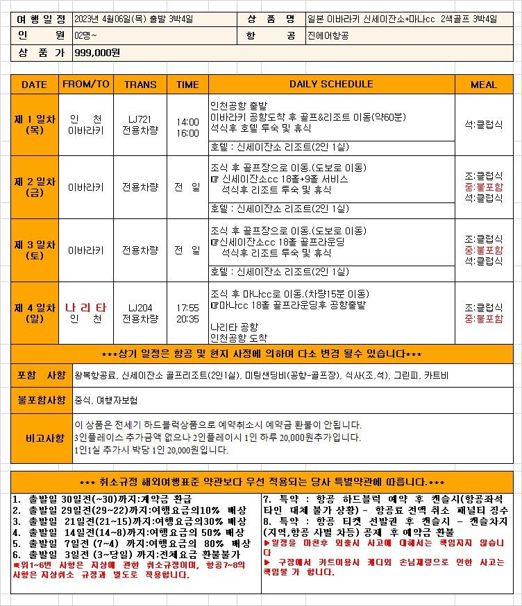 📌3차 4월06일(목)~09일(일) 40석 🌈상품가 999,000원