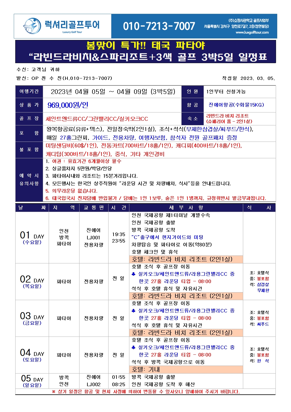 ⛳️파타야 명품 5성급 리조트 + 3색 골프 3박5일⛳️