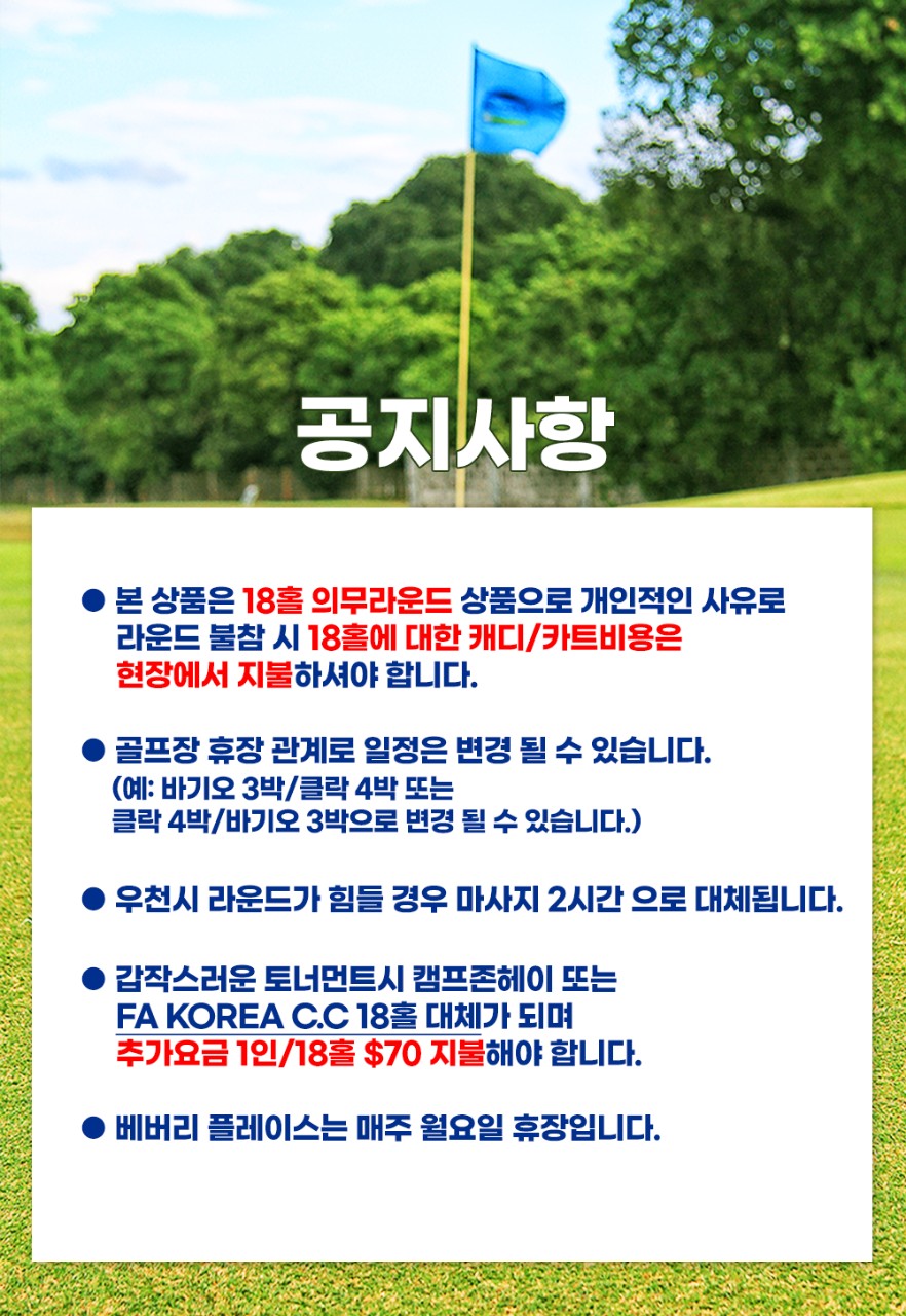 ● 캐디피,팁+카트비 ($50/18홀, $70/27홀, $90/36홀 – 2인1캐디/2인1카트 기준)