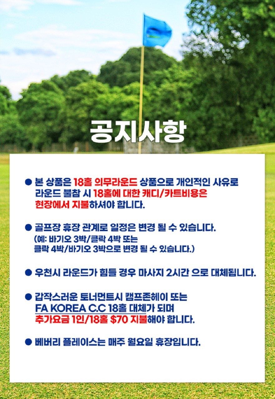 ● 캐디피,팁+카트비 ($50/18홀, $70/27홀, $90/36홀 – 2인1캐디/2인1카트 기준)