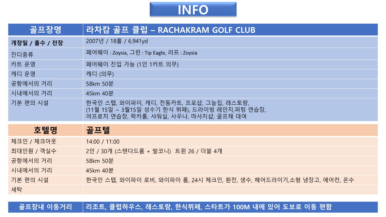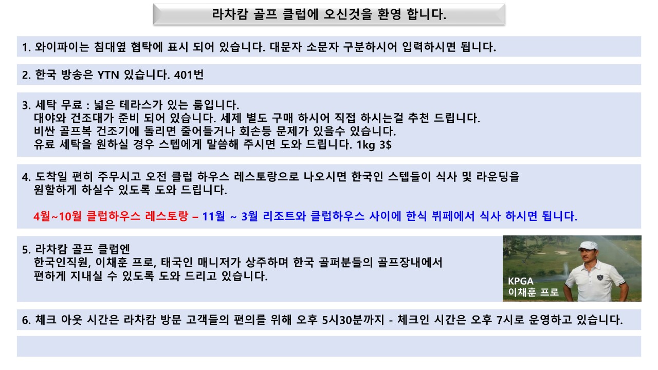 - 전동카드(700바트)/캐디피(400바트)/캐디팁(400바트) / 18홀 1인기준