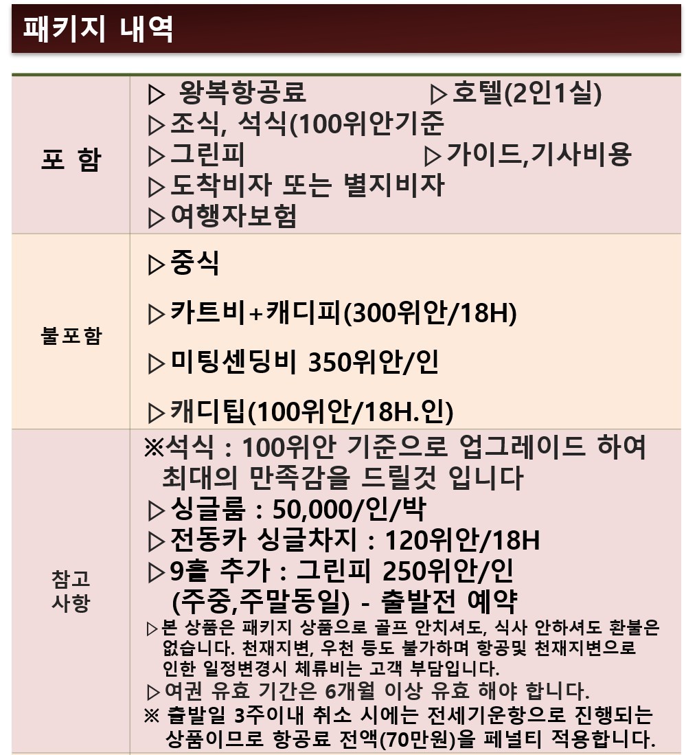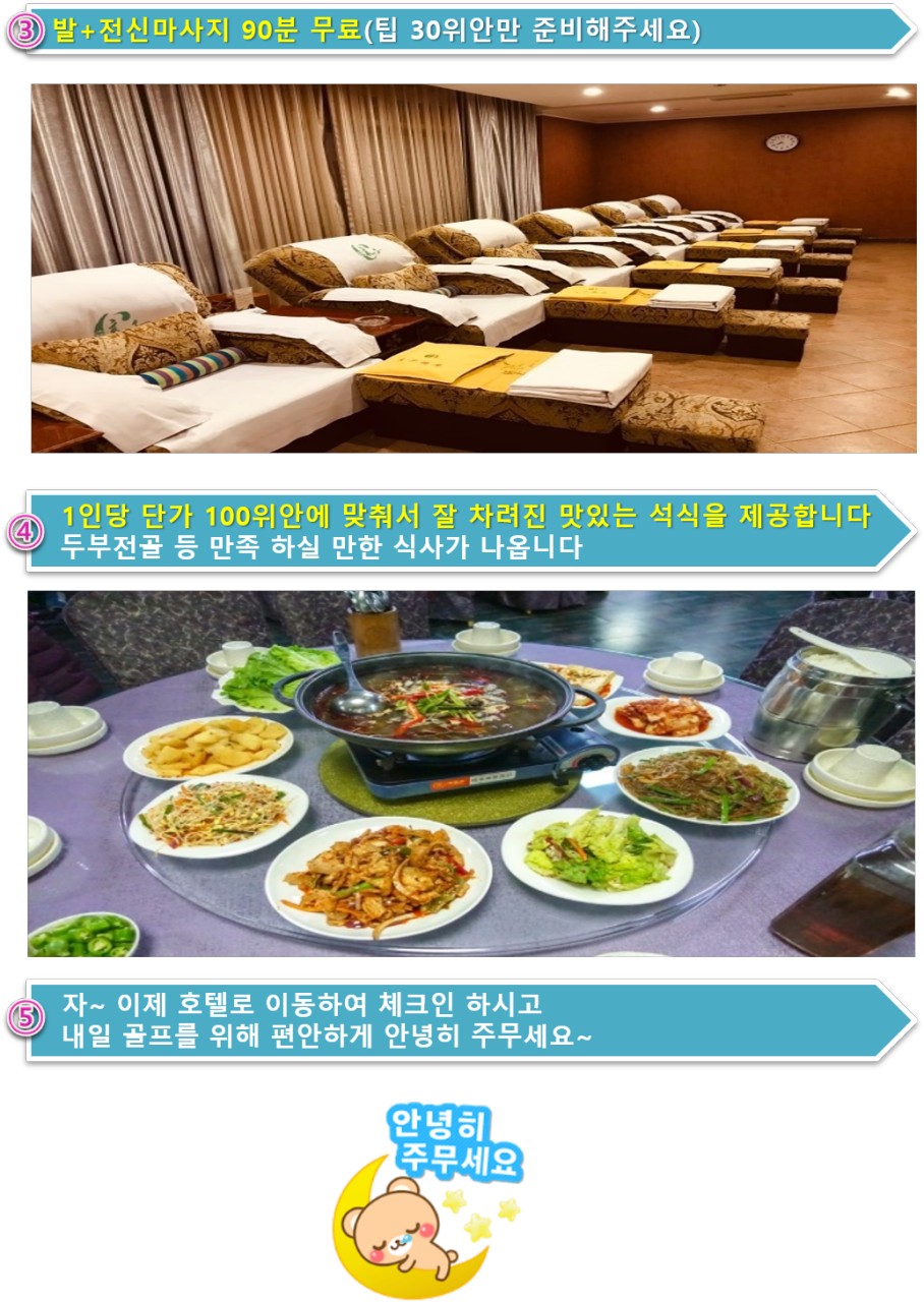 - 9홀추가 : 그린피 250위안/인 (주중, 주말 동일) - 출발전 예약